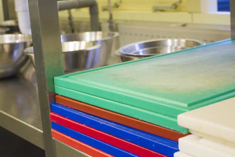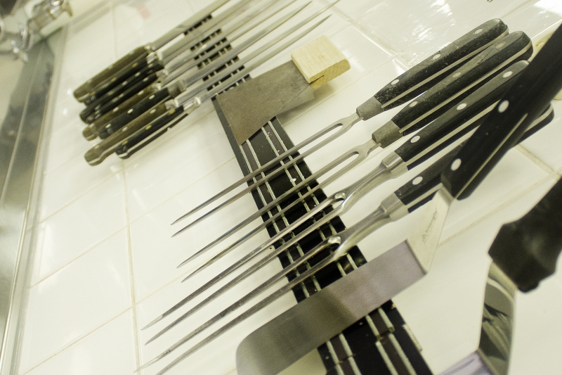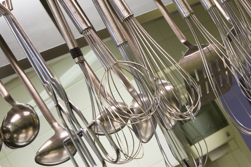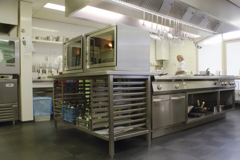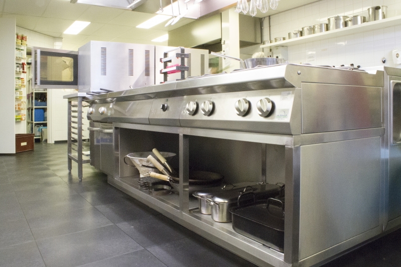 Tegen de wanden, in laden en kasten vindt men allerhande potten, pannen, keukengerei en borden. Op de werkplekken staat tevens nog een snijmachine, salamander en diverse keukenmachines opgesteld.